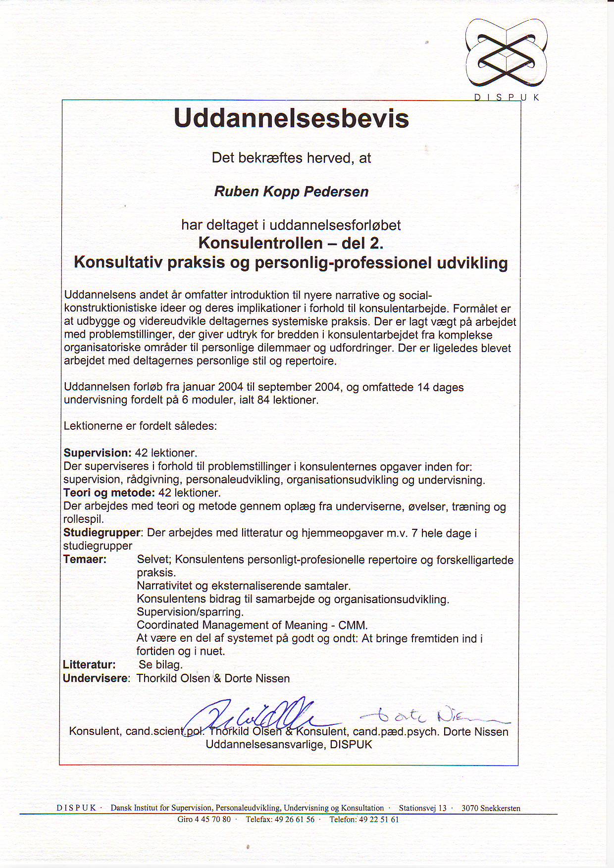 Nedenfor vises certifikater, diplomer og kursusbeviser vedrørende